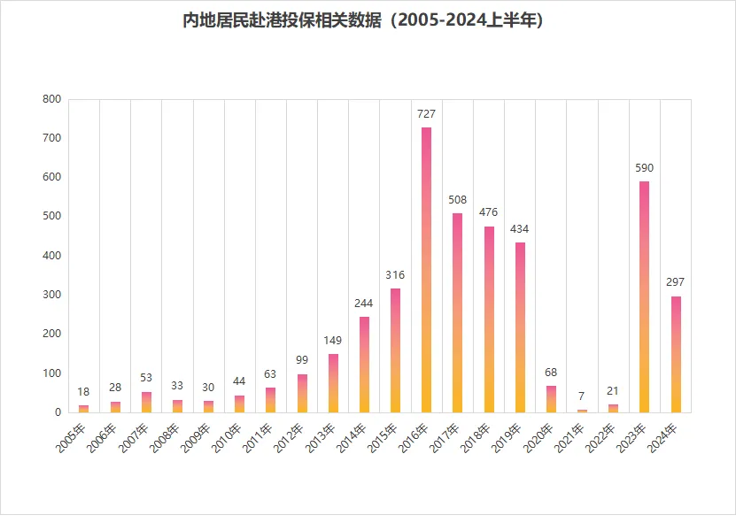 近10年,内地赴港投保数量大增。继2016年的727亿港元后,2023年内地赴港投保保费创下了590亿港元的历史第二高记录。2024年上半年赴港投保297亿港元,从目前的趋势看,超过2023年应该不是什么问题。N5