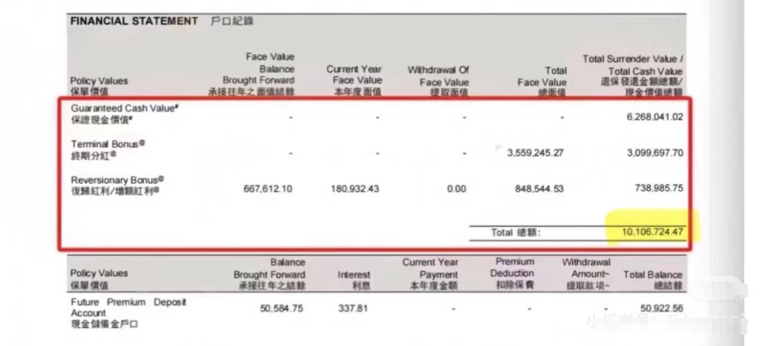 雅宁/文香港保险,在长期持有保单的情况下,预期回报率能有6%左右。比如这款分红储蓄险,年交10万美元,交5年,保单第20年,保单预期约有143万美元,是总保费的2.86倍。前提是在100%达成分红的情况下。有朋友会担心,这么高的预期利益是保险公司为了吸引客户而设计的,实际买了保单之后,分红有没有、分多少,都由保险公司说了算,没有安全感。实际上,香港的分红险和其他理财,有个本质的不同:我们买基金、股票等,都是一锤子买卖,赚了多少亏了多少,都是自己负责,而买了分红险,消费者和保险公司共享投资成果并共担风险,保险公司是要对结果负责的。怎么理解呢?1、保险公司必须要公布分红实现率根据监管要求,保险公司必须在每年6月30日之前公布分红产品的分红实现率。保险公司于2010年后发出的新保单,以及于报告年度内仍有有效保单的产品系列,都要在官网披露分红实现率或过往派息率。过往的分红实现率体现了保险公司的分红兑现能力,是决定保险公司市场竞争力的一个重要因素。如果分红数据太难看,会直接影响当下潜在消费者的选择,已经买过保单的客户,如果分红体验太差,下次可能也不会选择同一家保险公司了。保险公司的分红达成情况,不仅消费者会看到,行业内的竞争对手也会盯着。在香港,主流的保险公司有十几家,竞争非常激烈。如果一家保险公司的分红成绩单太拉跨,被竞争对手拿来PK,直接影响到消费者的选择,进而影响到公司业绩。为了吸引消费者,抢占市场份额,保险公司会尽努力达成预期分红。2、保险公司与客户的利益高度绑定我们去买基金,基金公司赚的是消费者买卖基金的申购费、赎回费、管理费等,消费者赚了还是亏了,和基金公司并没有关系。但我们买分红险,保险公司是把不少于90%的可分配盈余直接分配给保单持有人,公司股东获得剩余的可分配盈余。也就是说,保险公司股东想要在分红险业务上赚到钱,就要努力地提高分红险产生的可分配盈余,可分配盈余提高了,客户的利益也一定会提高。因此,消费者的利益和保险公司是高度绑定的。3、客户每年都能看到保单里具体有多少分红保险公司除了会在官网上公布产品的过往分红实现率,每年还会给客户发周年通知书,我们可以看到当年保单实际的总现金价值,对比计划书上展示的预期利益,可以知道自己保单的分红达成情况。比如下面是一位网友晒出的周年通知书:2016年买的保单,2023年(保单第7年)的现金价值总额为10,106,724.47美元,计划书展示的预期总利益是9,977,109美元,分红超预期达成。